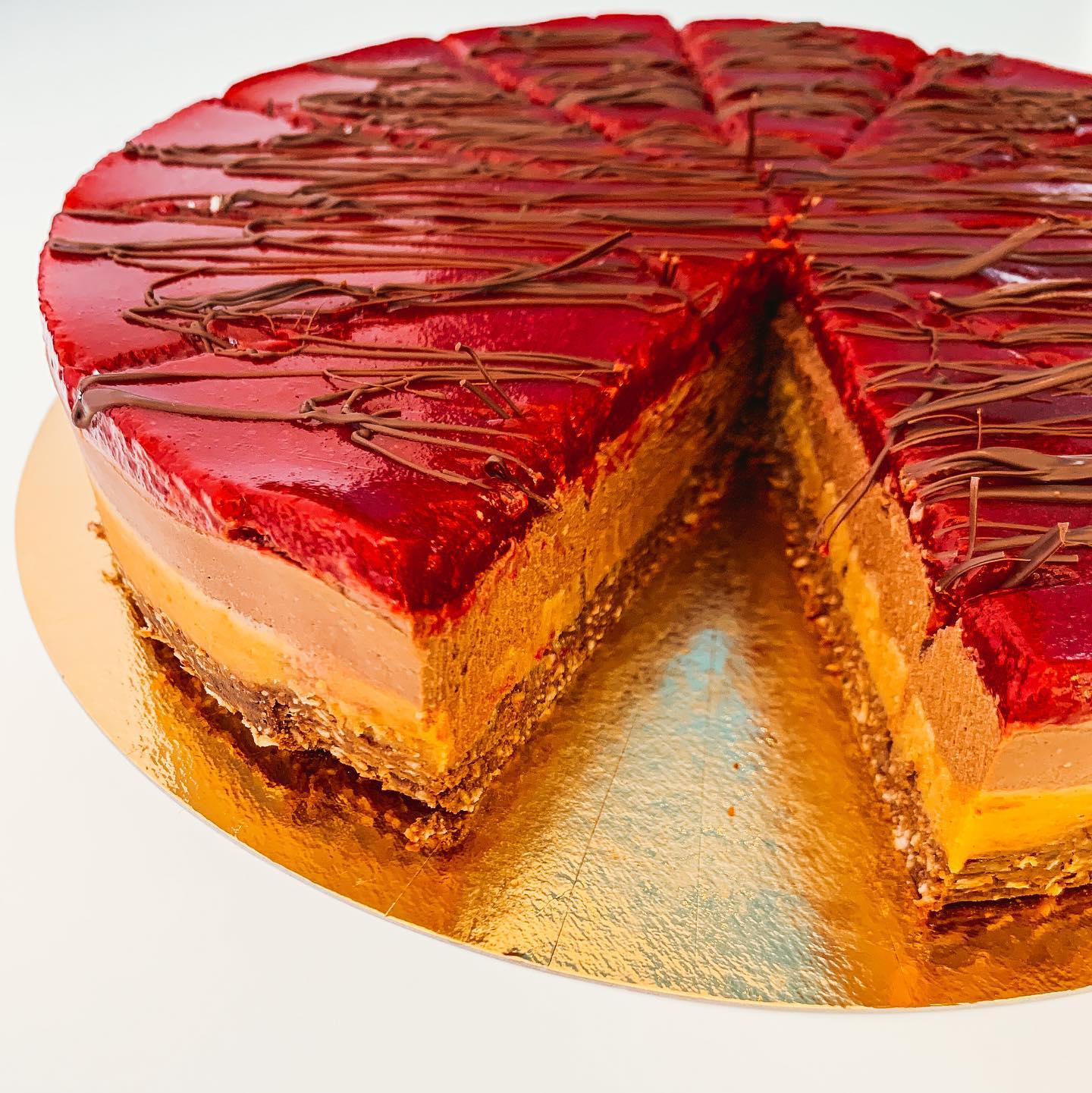 klasyczne połączenie czekolady i kwaśnych owoców. Daktylowo-kakaowy spód, karmel z masła orzechowego, ganache czekoladowy i frużelina wiśniowa, ozdobione abstrakcyjnymi wzorami z czekolady. Prawdziwa uczta dla smakoszy!